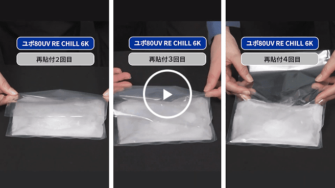 袋の材質との相性やしっとりとした開け心地、しっかり密着できることを念頭に開発した特殊な粘着剤を使用することで解決しています。